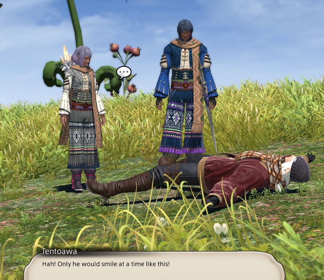 Just doing the Dawntrail tank role quests in which there is a totem that can put folks to sleep, and Amon gets hit by it. Thought this little exchange was cute!